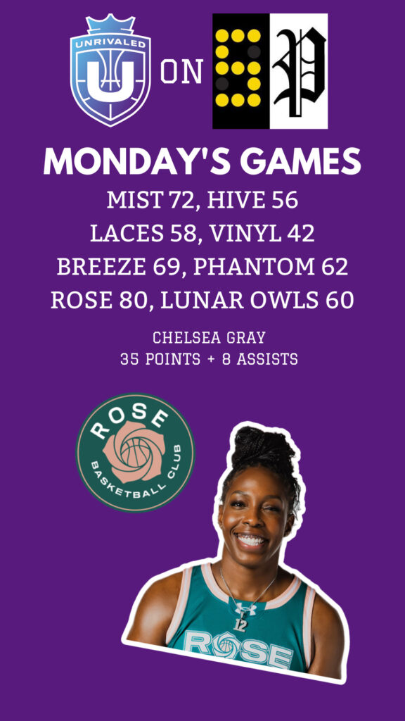 Your morning Unrivaled Scoreboard Page: Mist 72, Hive 56 Laces 58, Vinyl 42 Breeze 69, Phantom 62 Rose 80, Lunar Owls 60