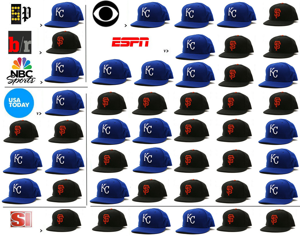 Some have called this the World Series without a favorite, and the “expert” picks we found seem to agree, giving the Giants only a slight 25-23 edge. Even if we exclude ESPN’s 28 — 28! — baseball experts, the Royals top the Giants 11-9.