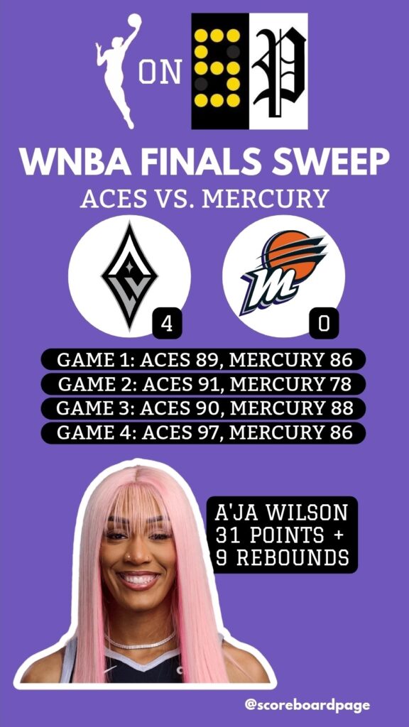 Your evening WNBA Scoreboard Page: Aces 97, Mercury 86. Las Vegas was 14-14 and went on an incredible run to finish the season, punctuated by a WNBA Finals sweep.